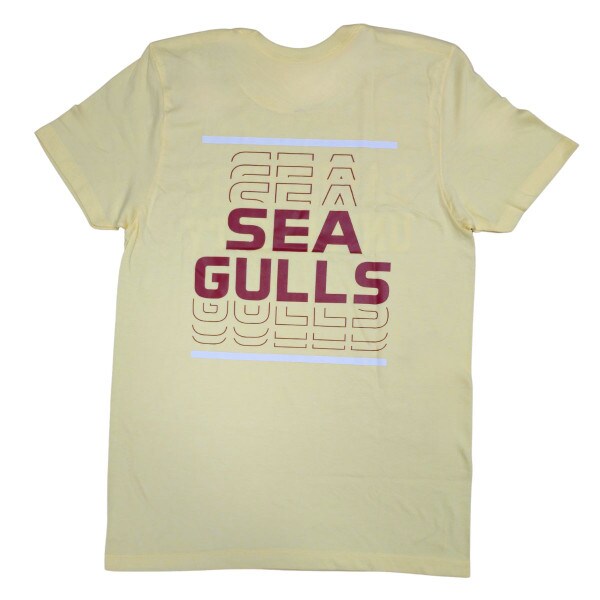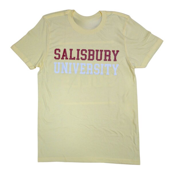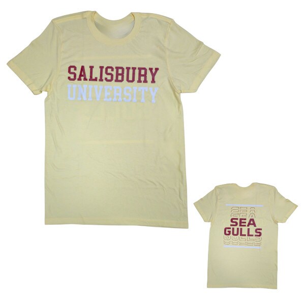 This sunrise tee features Salisbury University in maroon/white screen print lettering on the front. The back of the tee features Sea Gulls in a maroon/white screen print design. 60% Cotton. 40% Polyester. Wash with similar colors in cold. Gentle cycle. Tumble dry on low. Do not iron decoration.